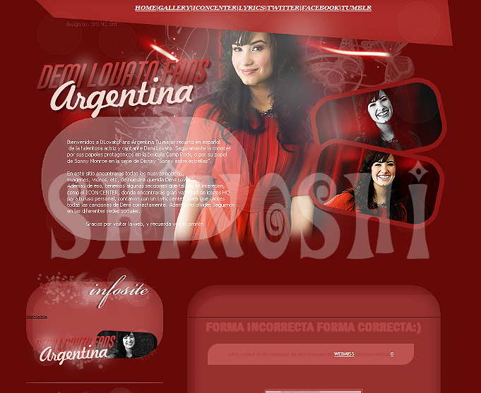 Nuevo pedido entregado^^ esta vez se trata de un diseño para el blog Demi Lovato Fans Argentina, Me gusto mucho el diseño, lo realize en tonos rojos, y un toque de blanco, Utilize los photoshoots del primer link que enviaste, creo que son del 2008, en fin, no lo quize re-cargar de luces, y esas cosas, esta vez lo hice muy sencillo y lindo:3' espero que te guste tanto como a mi me gusto, los codes te los envíe a tu correo, recuerda avisarme cuando lo pongas Online, asi te podre agregar a la seccion de "ONLINERS" y te agradeceriamos un monton que tambien nos avisaras cuando lo quites, recuerda no remover los creditos, y como vi que tienes una opcion de "creditos" nuestros botones estan en la seccion de "afilianos" -->